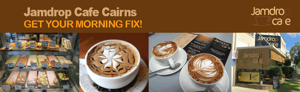 Located over the road from the Cairns Private Hospital Jamdrop is easy to find with our bright cream exterior and black Jamdrop logo. We are also are proud to offer all of our customers Vittoria Coffee Beans, the highest quality premium beans we can get our hands on. For a rich smooth coffee weather it be latte, cappuccino, piccolo latte or moka coffee, come try the Jamdop coffee experience today.